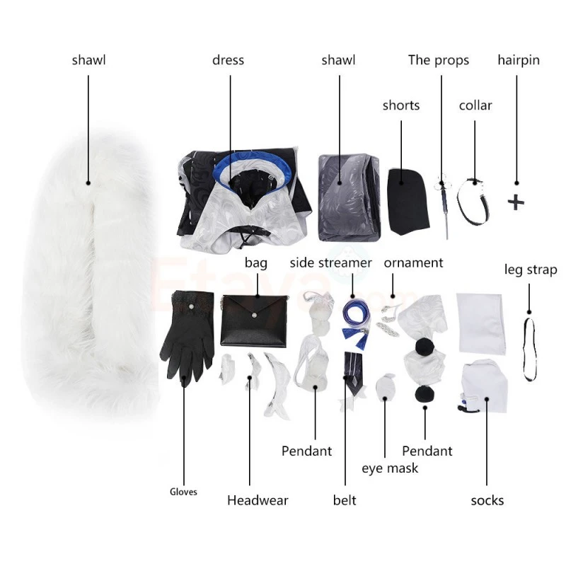 | Full Set Including | Shawl, Dress, Shorts, Props, Collar, Hairpin, Gloves, Headwear, Pendants, Belt, Bag, Side Streamer, Ornament, Eye Mask, Socks, Leg Strap |